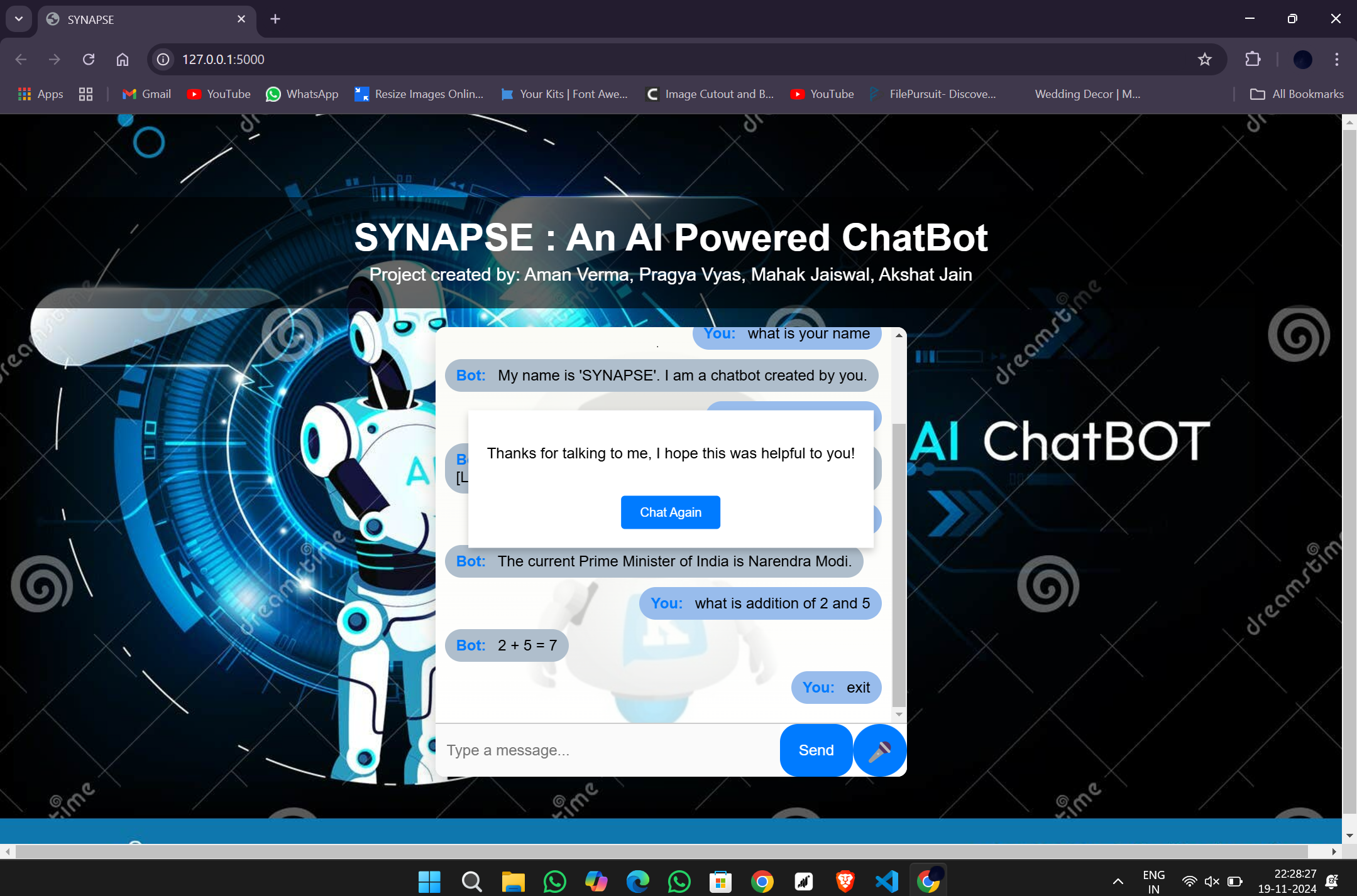 It is an AI powered ChatBot developed using Python, NLTK, and Gemini API. It responds to user using predefined responses, as well as surfing from the Internet.